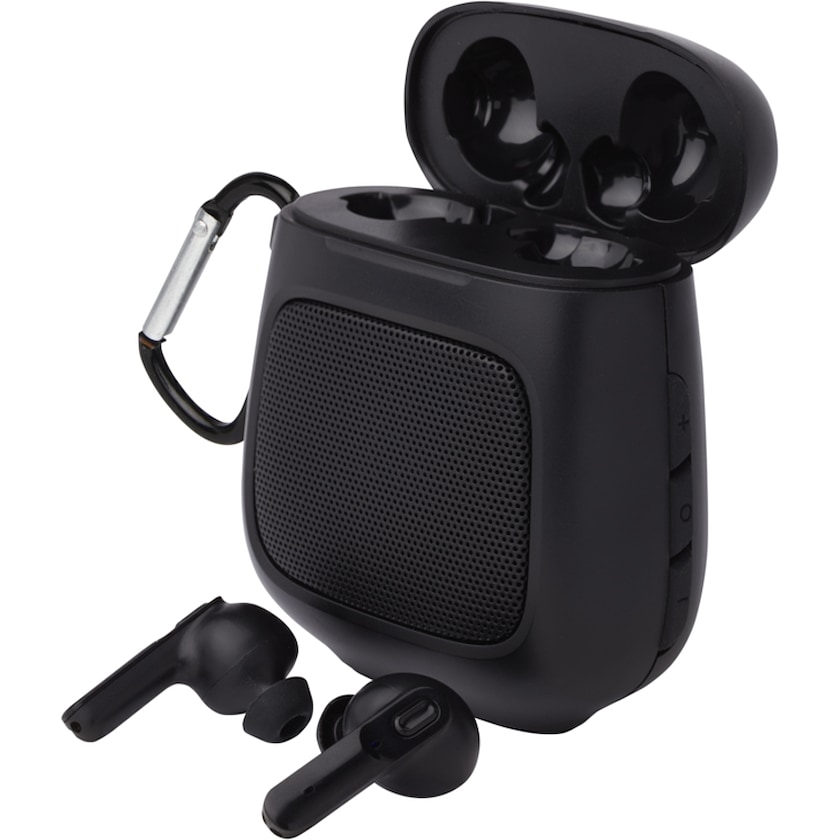 Trådlösa hörlurar med fodral som fungerar som högtalare. När hörlurarna tas ur förvaringsfodralet kopplas de automatiskt på och synkar med varandra. Förvaringsfodralet fungerar som laddstation och högtalare. När förvaringsfodralet är fulladdat klarar det att ladda hörlurarna 4 gånger. Hörlurarna har 4 timmars speltid på en laddning. Både hörlurarna och förvaringsfodralet har en inbyggd mikrofon så att telefonsamtal kan tas emot. Hörlurspluggar i storlekarna M och L medföljer.
