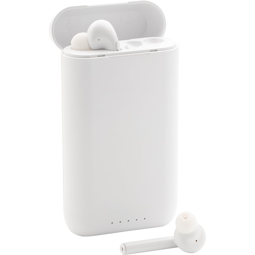 Hörlurar med integrerad powerbank. Hörlurarna använder BT5.0 för smidig anslutning till din mobiltelefon. Batteriet klarar en speltid på upp till två timmar. En laddning tar 4 timmar. Powerbanken har storleken 5.000 mAh och klarar att ladda upp din mobiltelefon upp till två gånger.