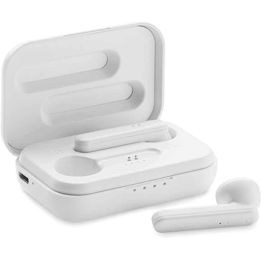 Trådlösa hörlurar inklusive smart laddstation. Hörlurarna har True Wireless Stereo 5.3 och drivs med ett 30 mAh-inbyggt batteri. Mikro-USB-kabel medföljer. Speltiden är ca 3 timmar.
