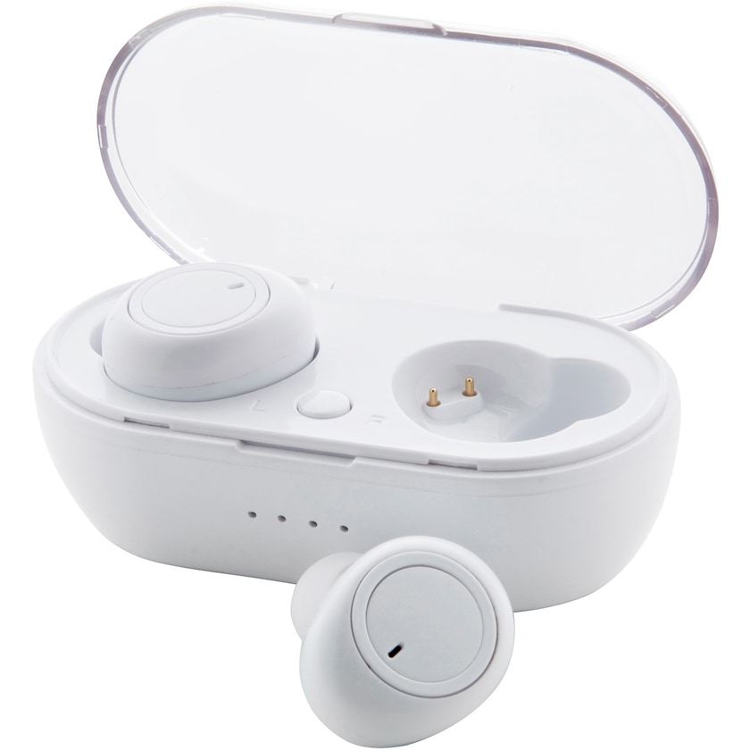 Trådlösa hörlurar med handsfree-funktion. Hörlurarna laddas i det medföljande fodralet. USB-laddkabel medföljer.