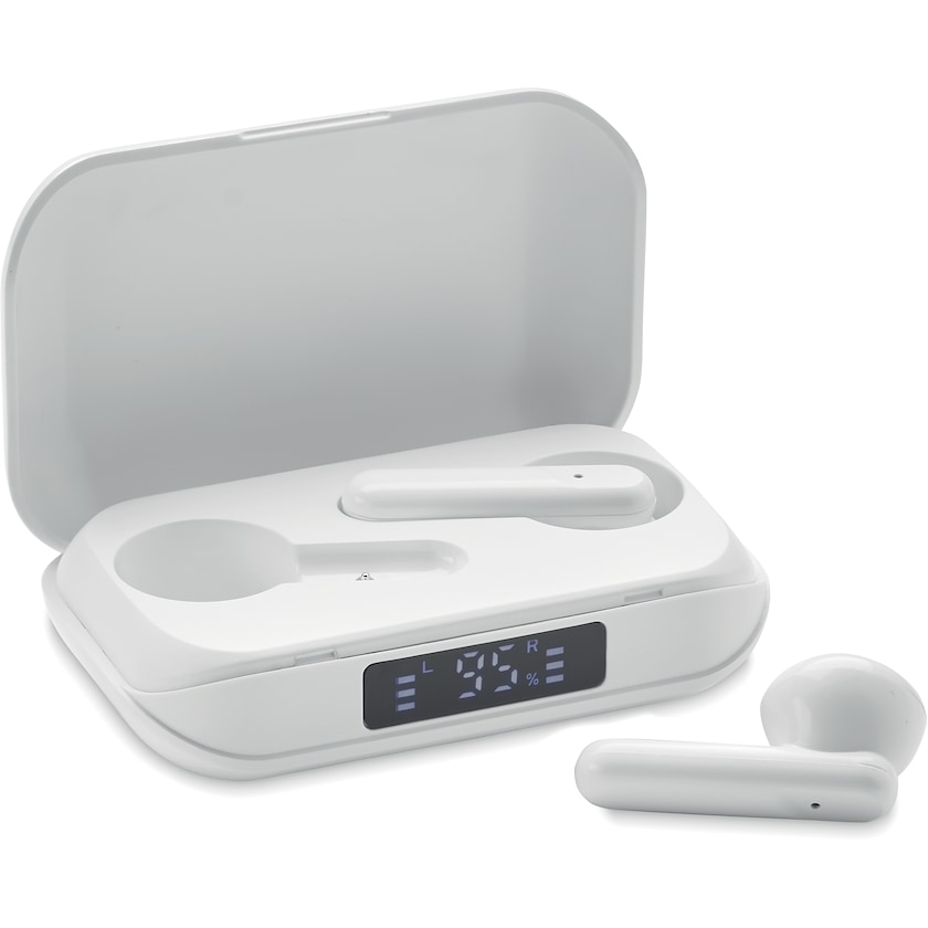 Trådlösa hörlurar av återvunnen ABS. Hörlurarna har stereoljud, inbyggd mikrofon och LCD-display som visar laddningsnivån. Automatisk parning. Typ C-laddningskabel samt laddningsstation medföljer.