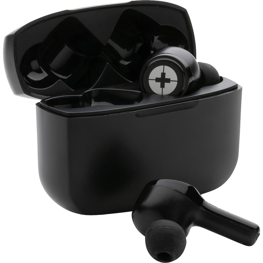 Förstklassiga hörlurar från Swiss Peak. Öronsnäckor och laddningsfodral är tillverkade av återvunnen ABS. BT 5.3-teknik säkerställer automatisk parkoppling och stabil anslutning. Speltiden är 3,5 timmar och räckvidden 10 meter.