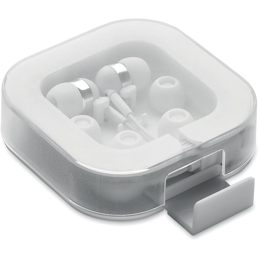 Hörlurar med fodral med mobilstöd. Kabeln är 120 cm lång. Extra silikonöverdrag i tre olika storlekar medföljer.