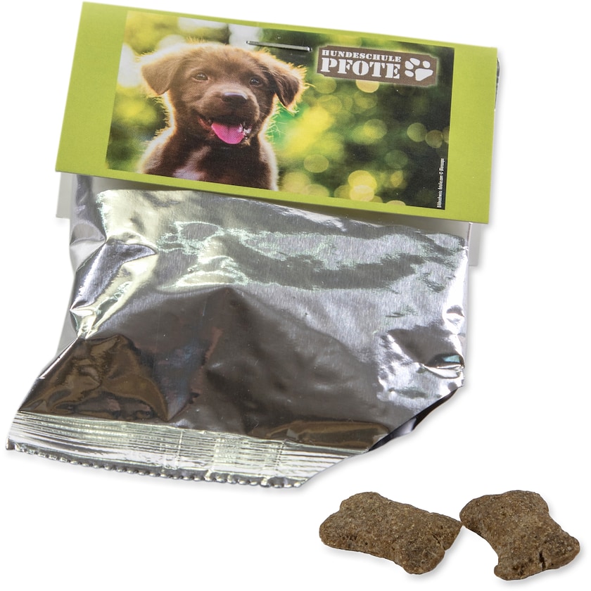 Påse med hundsnacks försedd med ett kort upptill med eget tryck. Kortet trycks helt efter dina önskemål. Hundsnacksen kommer från Happy Dog och passar hundar från 4 månader.