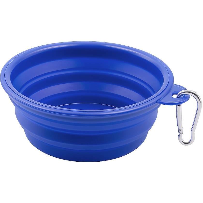 Vikbar hundskål med karbinhake. Tack vare att hundskålen kan vikas ihop tar den liten plats när den inte används.