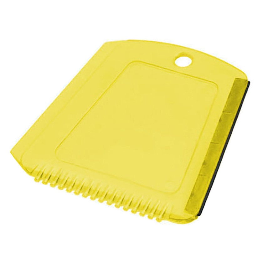 Snygg isskrapa med gummilist. Finns i flera frostade färger. Isskrapan har en taggad sida samt en jämn yta för borttagning av olika typer av is.
