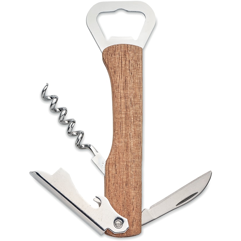 Kapsylöppnare med korkskruv och foliekniv. Höljet är tillverkat av bambu.