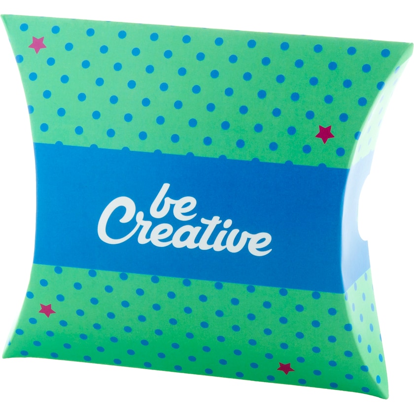 Liten presentkartong i kuddform. Hela utsidan trycks efter dina önskemål. Levereras omonterade i platt format.