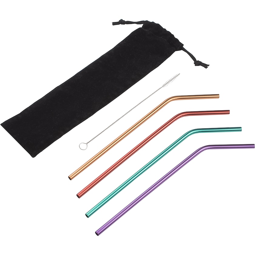 Set med fyra sugrör av rostfritt stål. Varje sugrör har måtten Ø 6 x 220 mm. Levereras i en praktisk förvaringspåse av sammet. Trycket sker på påsen. Sugrörsborste medföljer.