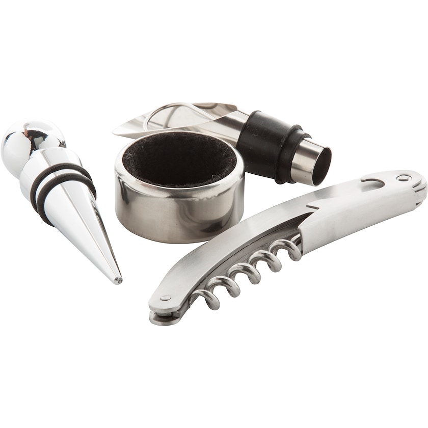 Vinset i fyra delar i presentlåda. Innehåller korkskruv, flaskförslutare, droppring och droppkork. Lasergravyren sker normalt på korkskruven.