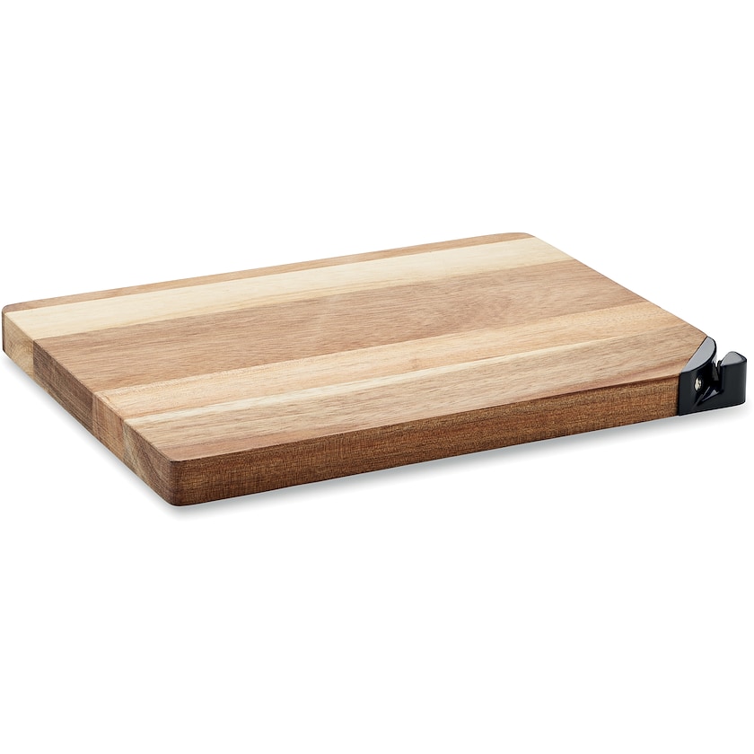 Påkostad skärbräda av akaciaträ. I ena hörnet finns en praktisk knivslipare. En perfekt gåva till den matlagningsintresserade.