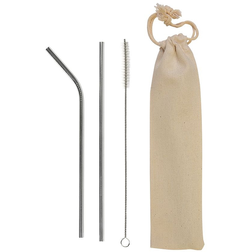 Set med två sugrör i rostfritt stål och en rengöringsborste. Setet levereras i en naturfärgad bomullspåse. Trycket sker på bomullspåsen.