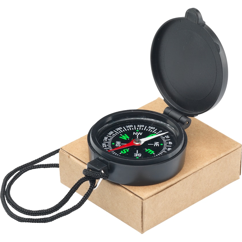 Kompass med halsrem. Tack vare halsremmen är det lätt att alltid ha kompassen tillgänglig när man rör sig i naturen. Levereras i en naturfärgad pappask.