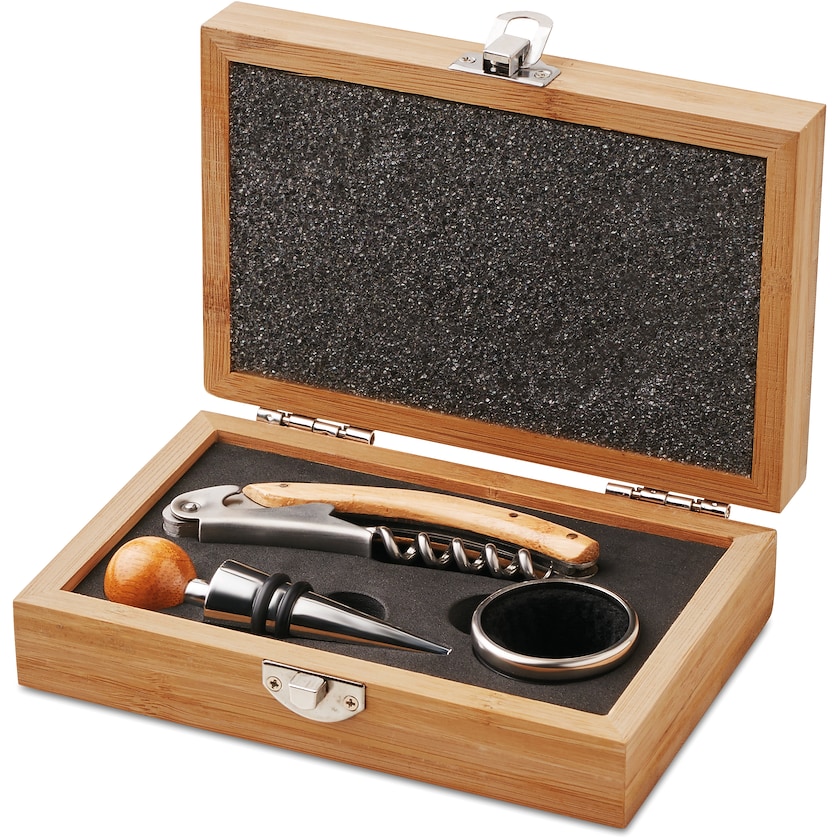 Litet vinset av rostfritt stål och bambu. Ett elegant set för alla som har en passion för vin. Tryck eller lasergravyr sker på förvaringslådan.