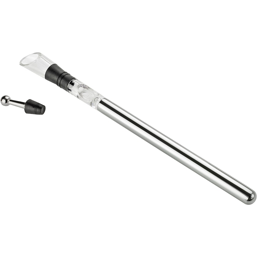 Exklusivt set med hällpip och kylstav. Kylstaven läggs i frysen innan användning och håller sedan vinet på rätt temperatur. Hällpipen försluter även flaskan så att aromen inte försvinner ur flaskan. Setet levereras i en snygg svart presentlåda. Trycket sker på presentlådan.