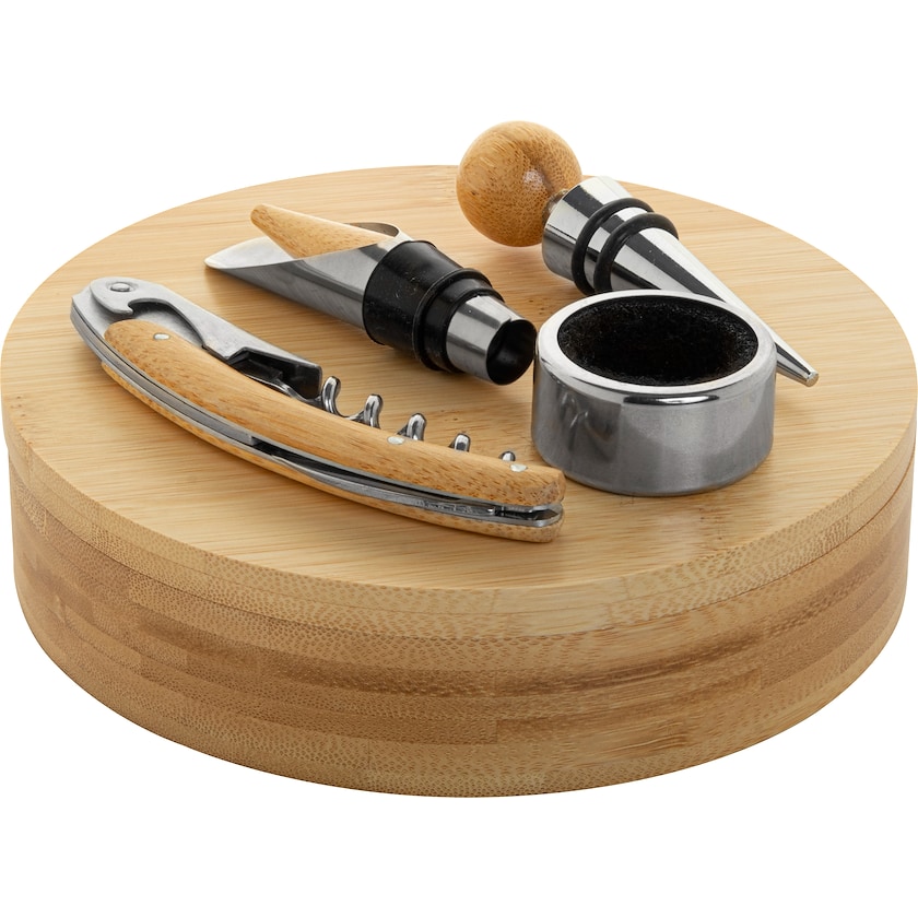 Vinset med fyra vintillbehör i rund bambulåda. De fyra vintillbehören är gjorda av bambu och rostfritt stål. En utmärkt gåva till vinälskaren.