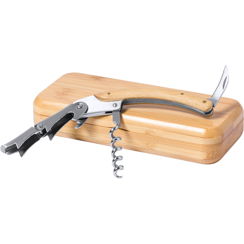 Vinöppnare av rostfritt stål och bambu. Vinöppnaren levereras i en snygg förvaringslåda av bambu. En perfekt gåva till vinkännaren.
