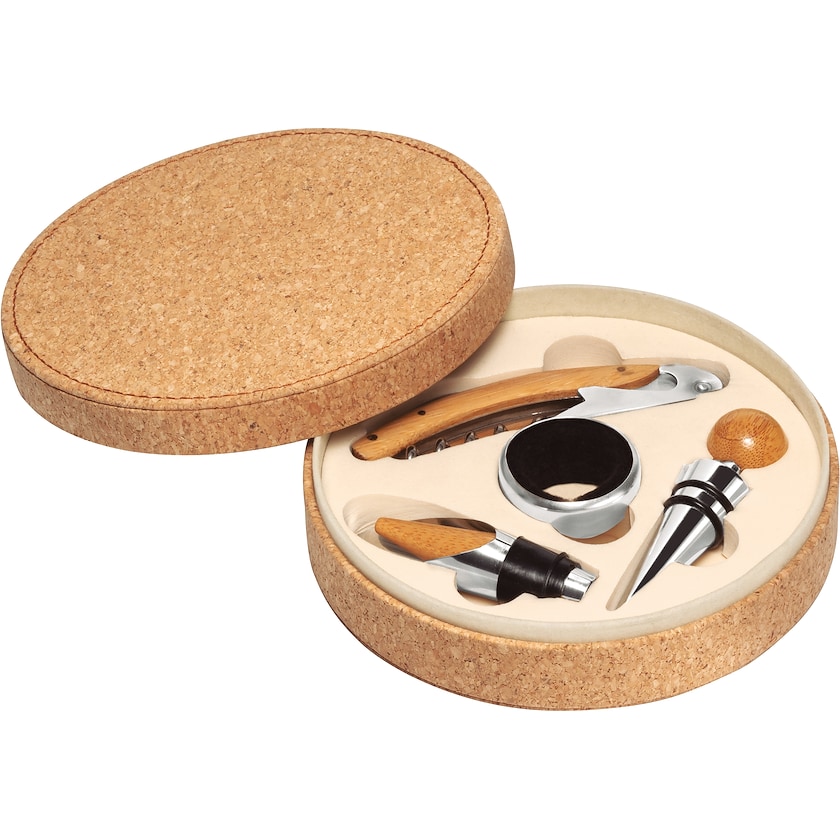 Vinset i snygg låda av kork. Här finns allt för den verkliga vinkännaren. Märkning sker med tryck eller lasergravyr på lådan.