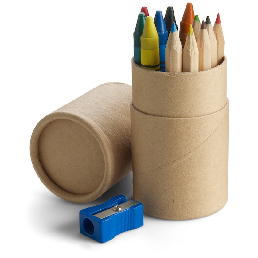 Papptub med 6 st kritor, 6 st färgpennor och 1 st pennvässare. Ett trevligt och prisvärt ritset för kreativa barn.