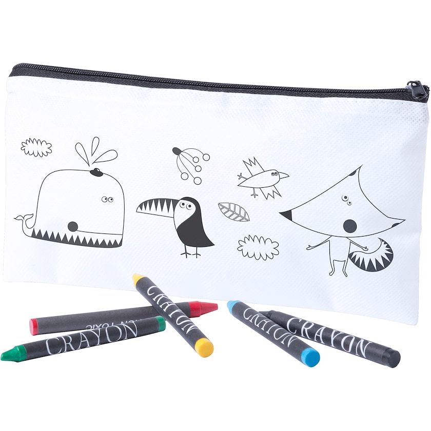 Ritset innehållande kritor och ett pennfodral. Pennfodralet har ett förtryckt motiv som man kan färglägga.