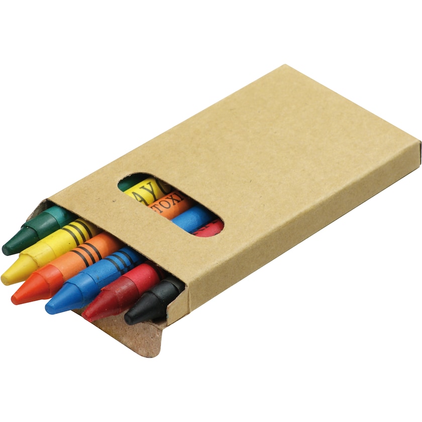 Litet kritset med tryck med 6 st färgkritor i naturfärgad pappask. Blivit ovän med barnen? Ge dem färgkritor!