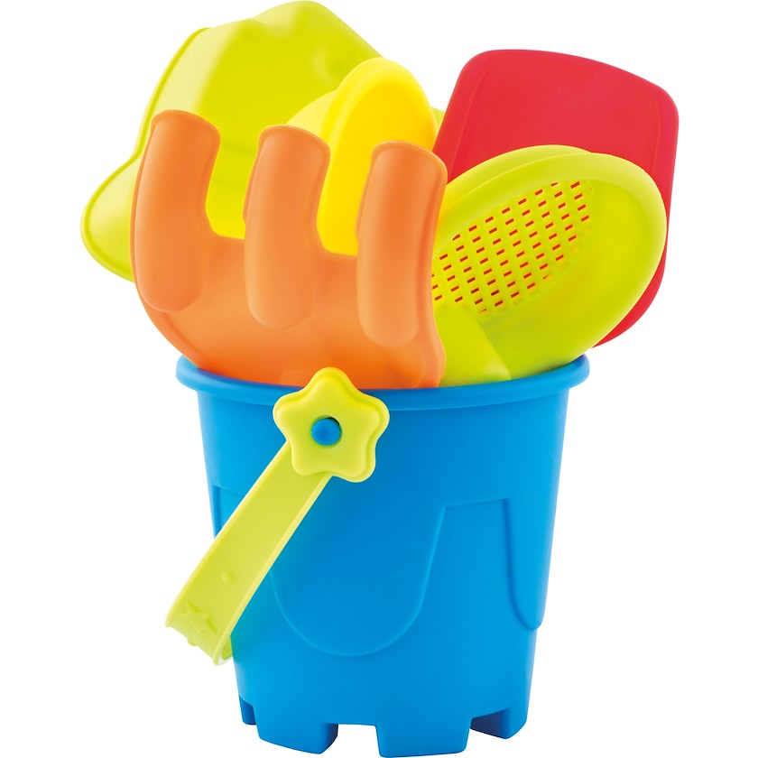 Strandhink med spade, kratta och två formar. Alla delar kommer i slumpmässiga färger. Trycket sker på nätpåsen, se tryckmallen för mer information. Beställ en strandhink med tryck hos Axon Profil!