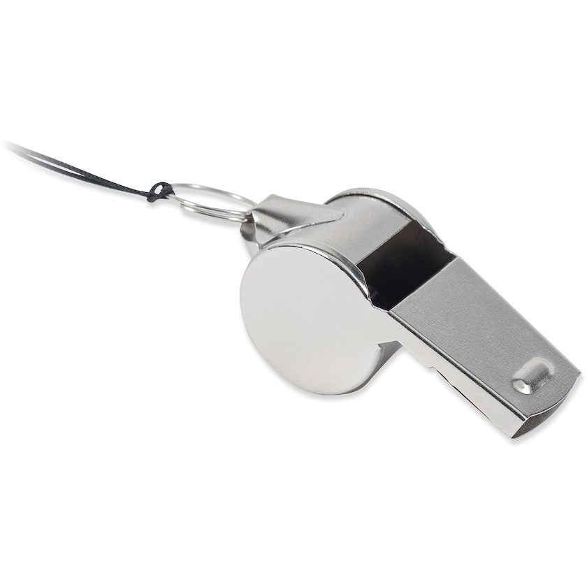 Visselpipa av metall. Visselpipan kommer med ett snöre. Märkning sker med tryck eller lasergravyr.