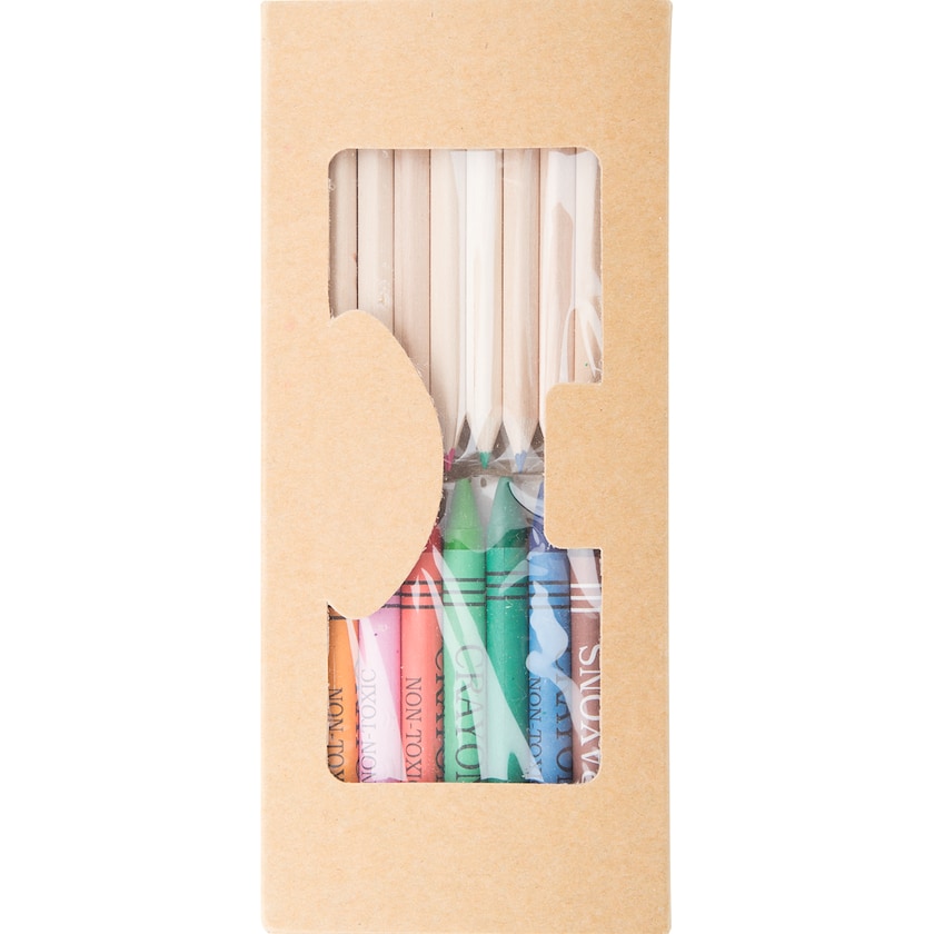 Set med 10 st färgpennor och 9 st kritor i en naturfärgad pappask.