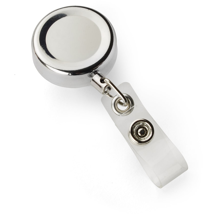 Lyxig passerkortshållare av metall. På baksidan finns ett kraftigt metallklips. Den elastiska vindan är 70 cm. Märkning sker med lasergravyr.
