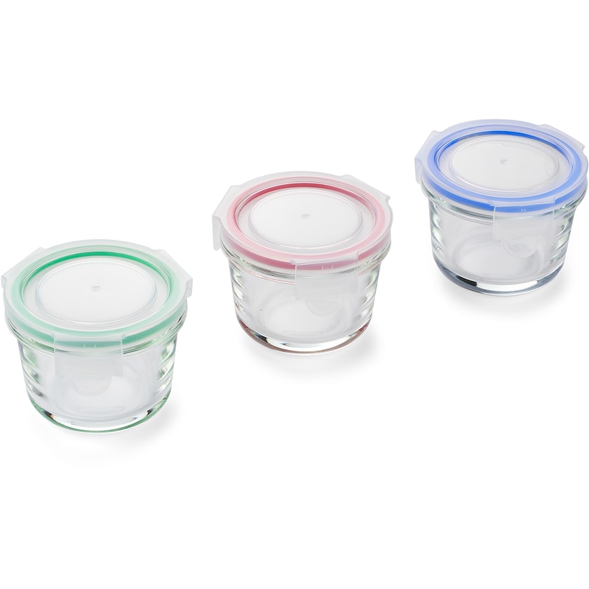 Set med tre småburkar. Burkarna är tillverkade av brosilikatglas som tål stora temperaturskillnader. Tryckpriset avser tryck på en av burkarna. Burkarna kan utan problem användas i diskmaskin, mikrovågsugn, ugn samt frys.