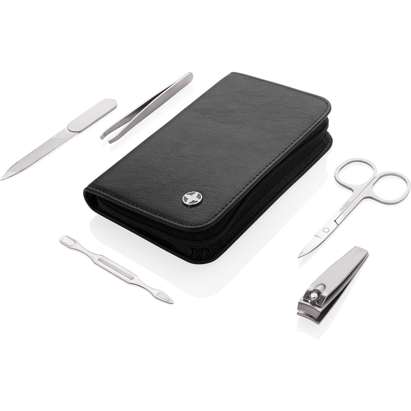 Exklusivt manikyrset från Swiss Peak. Setet innehåller 5 delar som alla är tillverkade av rostfritt stål. Märkning sker med gravyr på förvaringsfodralets konstläder.