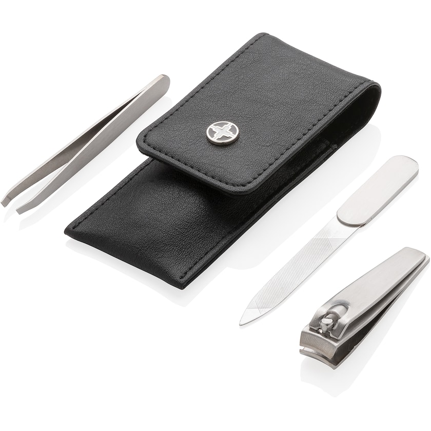 Litet manikyrset från Swiss Peak. Setet innehåller tre delar. Alla delar är tillverkade av högkvalitativt rostfritt stål. Märkning sker med gravyr på förvaringsfodralets konstläderyta.