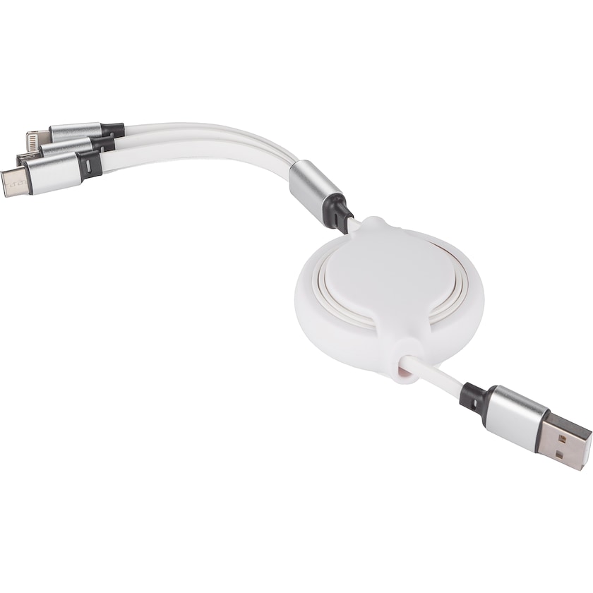 Utdragbar 3-i-1-kabel. Har uttag typ-c, lightning och mikro-USB. Expanderar 115 cm.