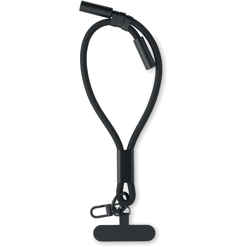 Laddnings- och datakabel i form av en telefonhållare med handledsrem. Kablarna är av typ-C till typ-C och är tillverkade av rPET.