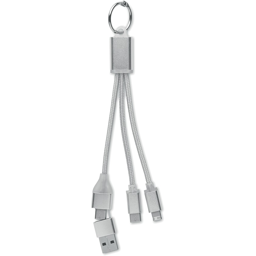 Laddkabel med nyckelring och tre kontakter. Kontakterna är av typen 2-i-1-typ-C & A, mikro-B samt typ-C. Välj mellan tryck och lasergravyr.