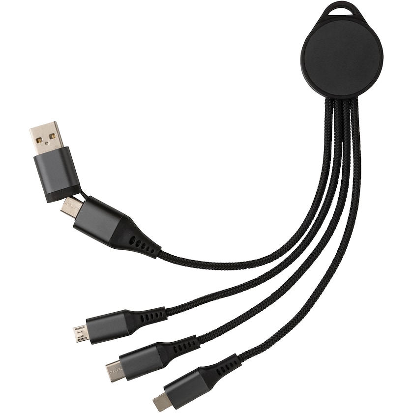 Laddkabel av återvunnet material. Ulysses är tillverkad av återvunnen aluminium, TPE och PET. Laddkabeln har totalt sex laddningsalternativ. Kabeln är 12 cm lång. Levereras i en presentlåda av miljömärkt papper.