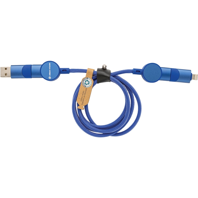 Snabbladdningskabel av återvunnet material. Laddkabeln mäter 120 cm och har fem olika kontakter. Hela laddkabeln är producerad av återvunnet material. Levereras i en snygg presentlåda.