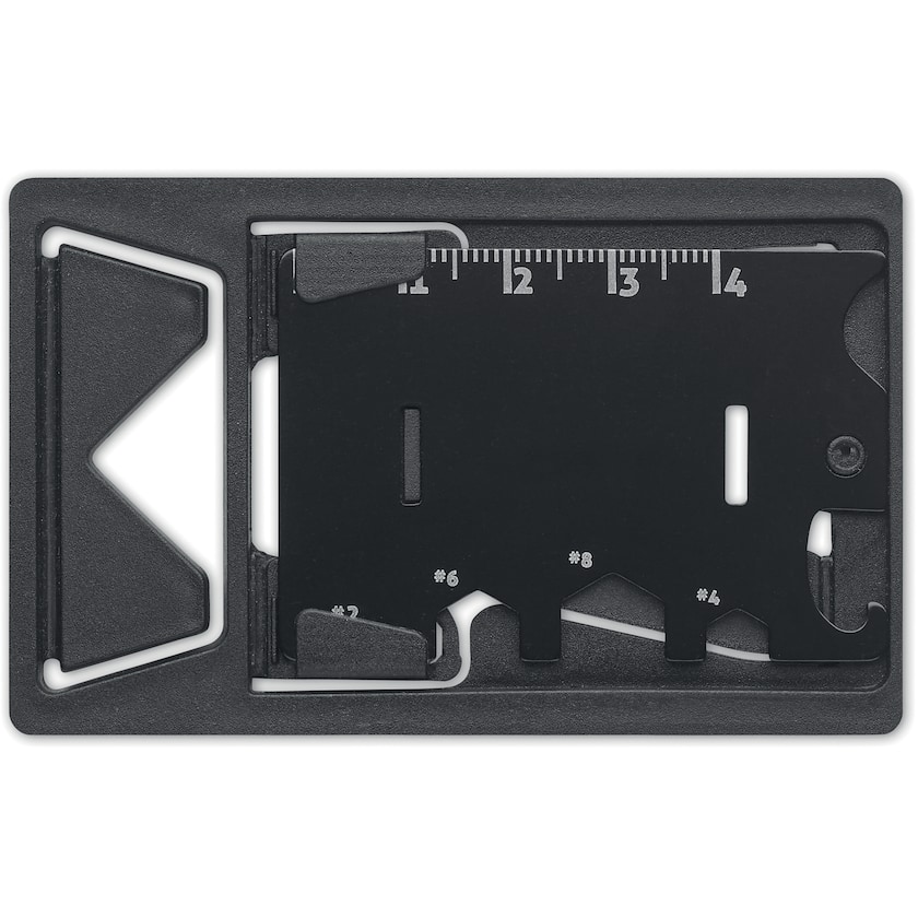 Mobilstöd av rostfritt stål med sex extra funktioner. De extra funktionerna är linjal, sexkantsnyckel, flasköppnare och skruvmejslar. Levereras i ett fodral av konstläder.