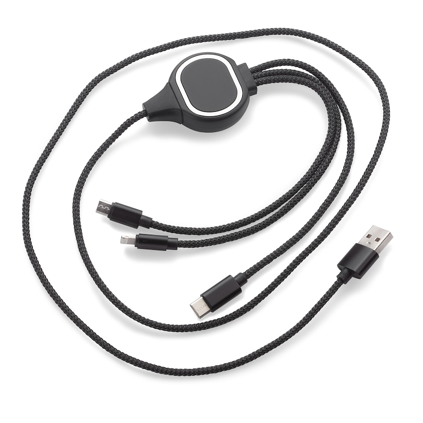 3-i-1-kabel med upplyst logotyp. Kabeln innehåller mikro-USB, USB-C samt lightning (iPhone). Kablarna är bara till för laddning. När någon av kablarna används blir din lasergraverade logotyp självlysande.