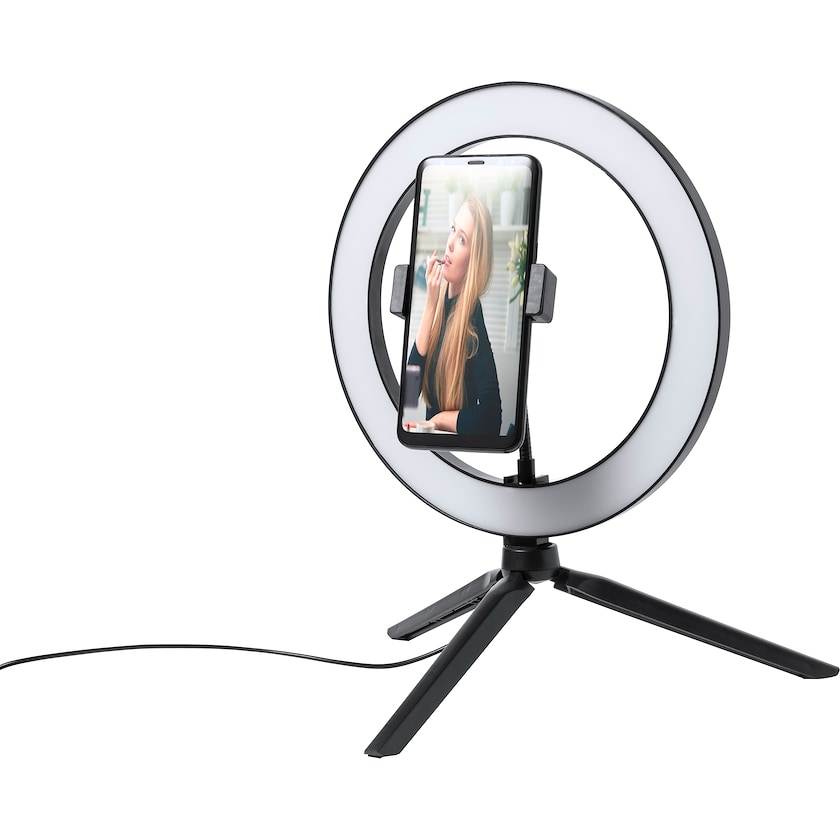 Ringbelysning för film, foto och videomöten. Montera din mobiltelefon i hållaren, justera ljuset och du har perfekt ljus för din selfie eller ditt videomöte. Levereras med USB-laddkabel. Höjden på lampan är reglerbar.