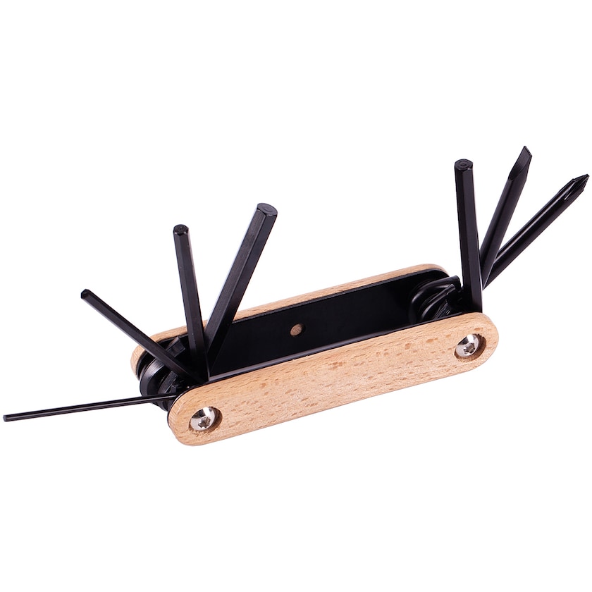 Elegant multiverktyg av trä och svart metall. Multiverktyg Amsterdam har sju funktioner. Märkning sker med lasergravyr.