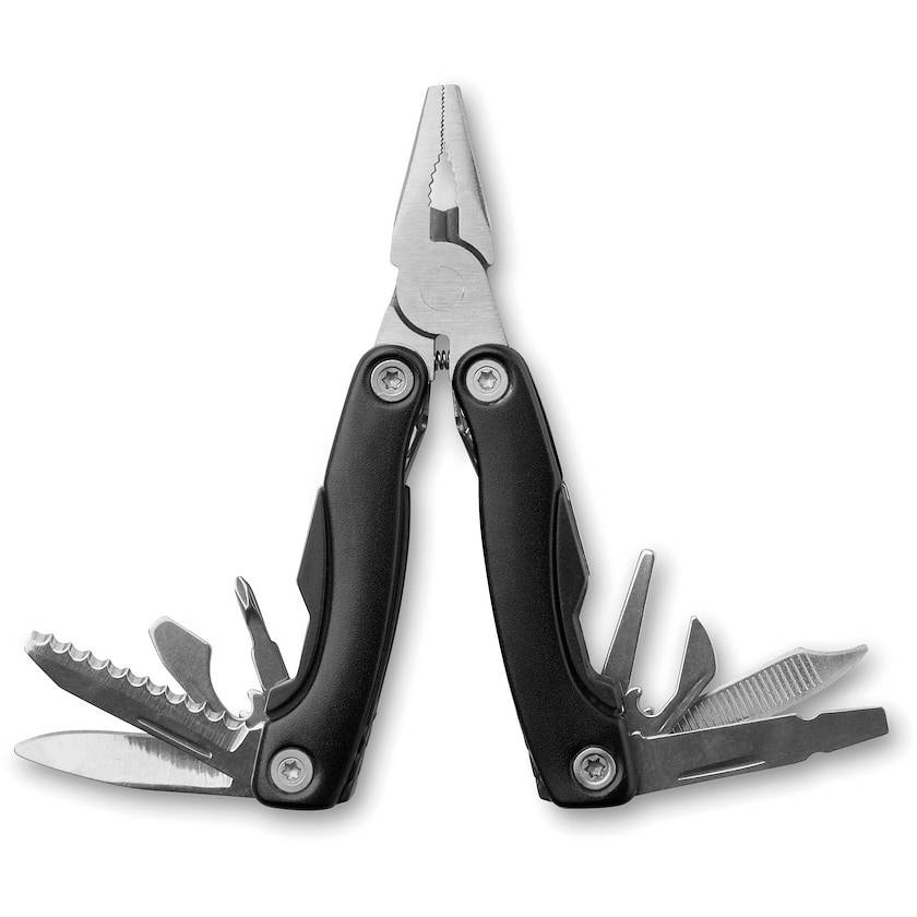 Multiverktyg av rostfritt stål. Verktyget innehåller 9 olika verktygsfunktioner. Märkning sker antingen med 1-färgstryck eller lasergravyr.