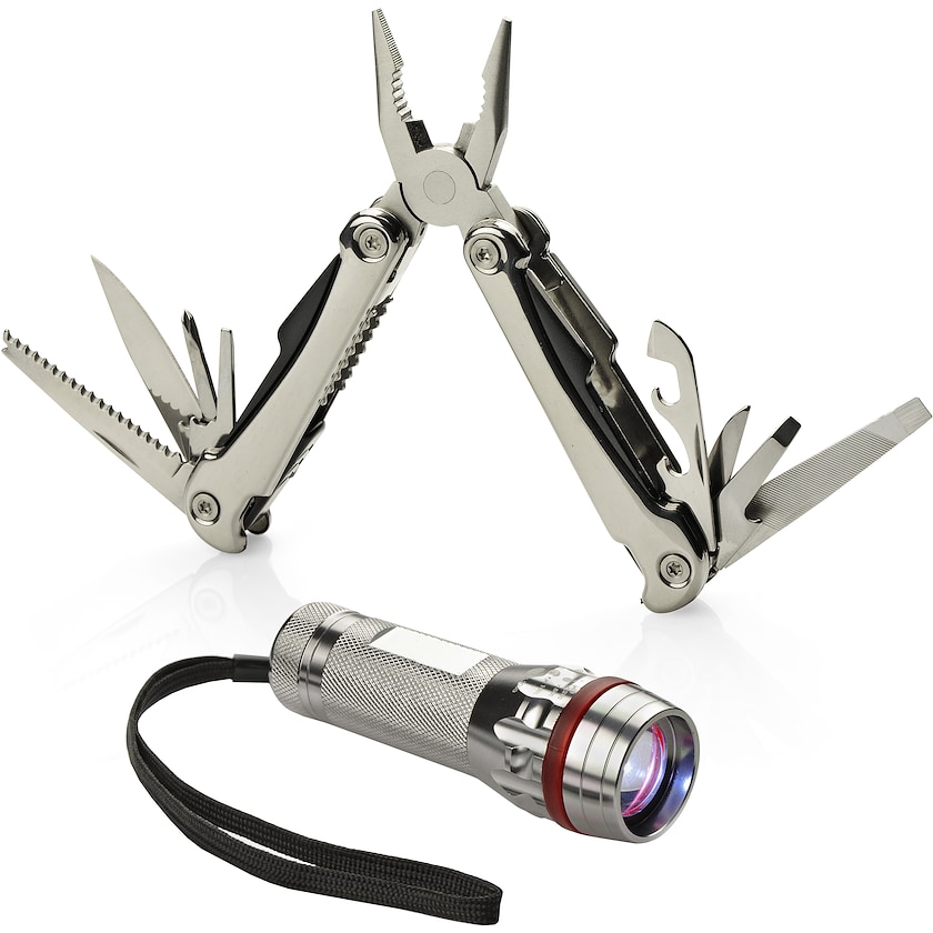 Exklusivt gåvoset innehållande ficklampa och multiverktyg. Ficklampan har en väldigt stark lysdiod, justerbart ljus med zoomfunktion samt tre ljuslägen: stark, svag och blinkande. Både ficklampa och multiverktyg är tillverkade av metall och levereras i en elegant svart presentlåda. Märkning sker med lasergravyr och max märkningsstorlek är 80 x 20 mm på ficklampan och 60 x 7 mm på multiverktyget.