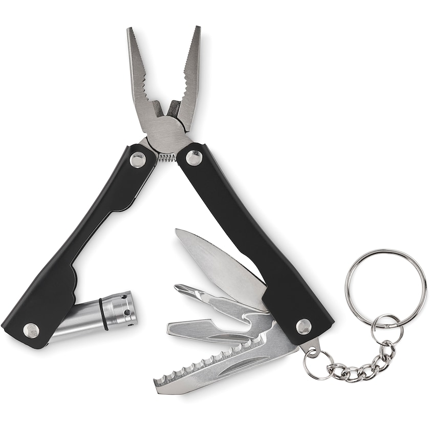 Multiverktyg med ficklampa. Innehåller tio olika verktygsfunktioner. Levereras i en förvaringsväska. Tre AG3-batterier medföljer.