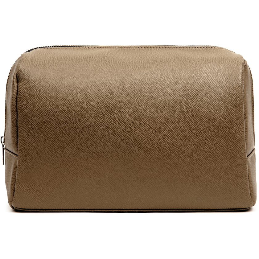 Tidlöst designad necessär. Utsidan är tillverkad av återvunnet konstläder. Tack vare den långa dragkedjan är det lätt att nå innehållet.