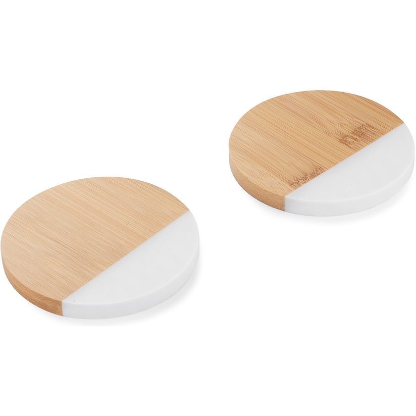 Set med två glasunderlägg av bambu och konstgjord marmor. Materialet är tåligt och motståndskraftigt mot skador. Levereras i en presentlåda av naturfärgad kartong.