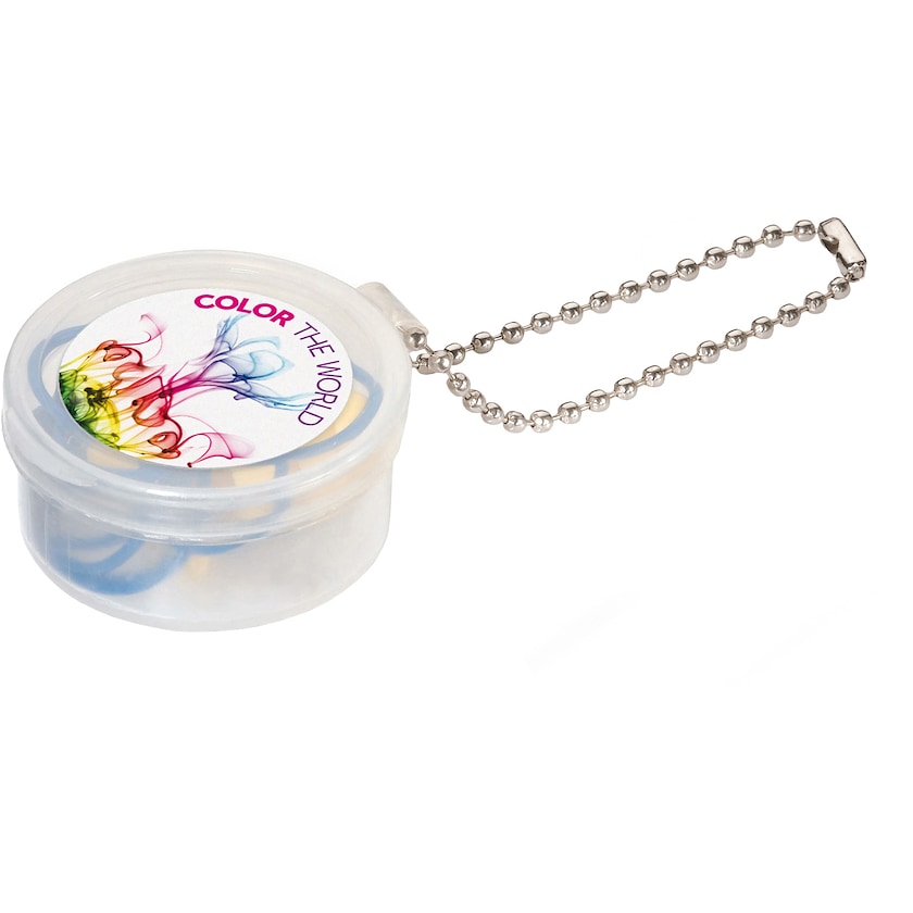 Liten plastburk med öronproppar med etikett som digitaltrycks. Plastburken är försedd med en liten metallkedja. Öronpropparna är sammankopplade med ett snöre vilket gör att man kan hänga dem runt halsen när man inte använder dem.