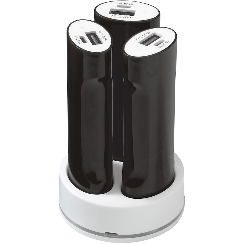 Set med 3 st powerbanks som laddas upp i en dockningsstation. Ladda upp för hela familjen på en och samma gång! Laddkabel till dockningsstationen ingår. Varje powerbank har kapaciteten 2.200 mAh. Märkningspriset avser tryck på en av powerbankens.