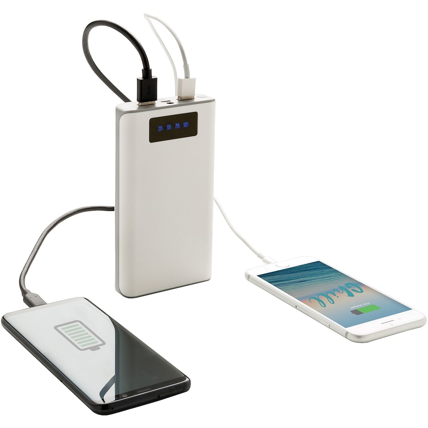 Kraftfull powerbank på hela 10.000 mAh. Powerbanken är försedd med en batteriindikator som visar kvarvarande energinivå (25 %–50 %-75 %–100 %). Den har två USB-utgångar vilket möjliggör laddning av två enheter samtidigt. Output: 5 V/2.6 A, input 5 V/2 A. Mikro-USB-kabel medföljer.