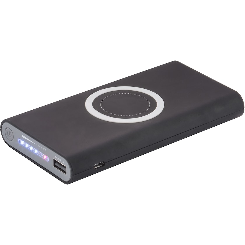 Extremt kraftfull powerbank med trådlös laddning. Utöver den trådlösa laddningen kan även laddning ske via mikro-USB-kabel eller C-typ-USB-uttag. Input: 5V/2.1A, output: 5V/2.1A.